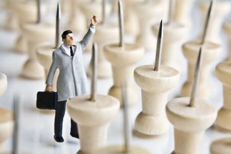 Miniature business concept - a businessman standing beside red and blue thumbtack push pin with white background