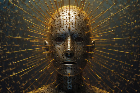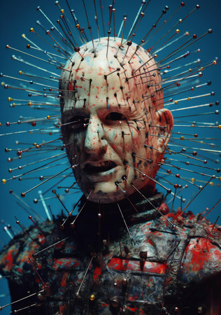 studio shot of an unrecognizable man piercing his head with a safety pin, created with generative ai