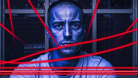 A man with a serious expression stares directly into the camera, his face illuminated with a striking blue hue. The background reveals a window with raindrops visible on the glass, suggesting a moody or tense setting. Several red laser beams cut horizontally across the image, creating a sense of entrapment or surveillance. The man is wearing a light-colored shirt which contrasts with the intense colors of the lasers and his face. His features are pronounced, with slight stubble and detailed texture visible on his skin. The overall atmosphere is one of tension, mystery, and high-tech intrigue.