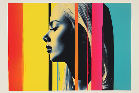 Generative AI, Poster with fashion woman face in risograph and glitch style, vivid colors