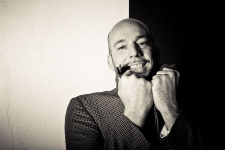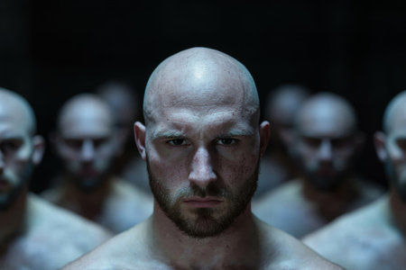 Intense bald man with beard staring at camera