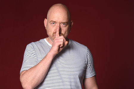man showing silence sign with fingers on red background