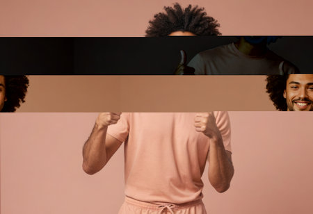 Contemporray art collage of young man, faceless, with black and white face stripes isolated over pink background. Personality