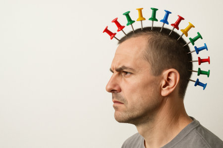 A man with multi-colored buttons on his head. Space for text