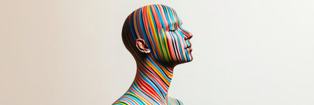 Side profile of a mannequin with multicolored stripes against a neutral background. Represents unity in diversity and inclusion.