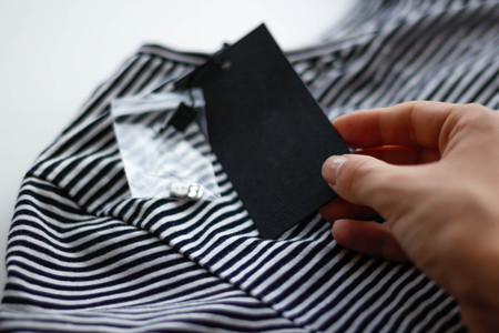 Hand holds a black label on the shirt. Closeup.