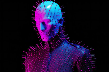 Artificial intelligence robot cyborg mannequin in neon light.