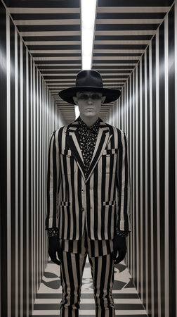 An AI generated illustration of a mannequin dressed in a monochromatic black and white striped ensemble in an abstract pose