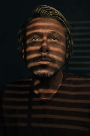 Dark mysterious portrait of blond man with light blue eyes and stubble beard in light through blinds.