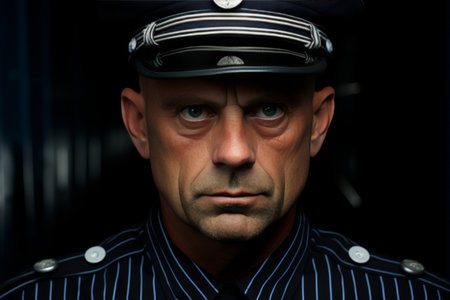 A man is wearing in an uniform and hat has a serious expression on his face.Concept of authority