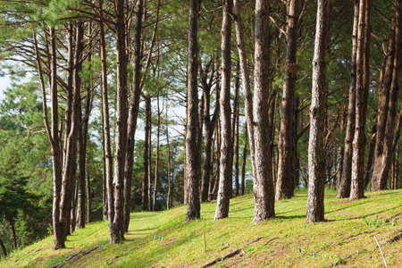 Tall pine trees of forest near Divcibare, mountain resort in Serbia, selective focus