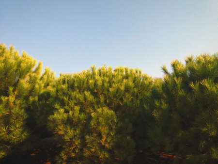 Fresh spring morning colors yellow brown blue needle tree fir branch in a sunny sunset forest park blurry background with free copy space for text. Photo in retro vintage hipster style of processing