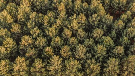 Aerial top view pine forest. Texture of coniferous forest view from above. Green background nature. Picture taken using drone.