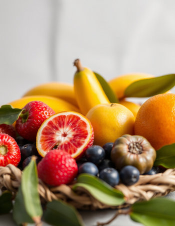 A beautiful display of assorted fresh fruits in a wicker basket against a soft pastel background, promoting a healthy lifestyle and vibrant colors for culinary creativity.
