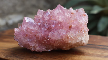 The pink quartz crystal cluster displays stunning transparency and vibrant hues. It rests elegantly on a wooden surface illuminated by soft natural light showcasing its unique formations.