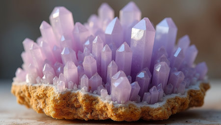 Lavender crystal formation on golden sandstone base catching sunlight in warm hues