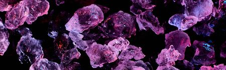 panoramic shot of transparent ice cubes with purple illumination isolated on black