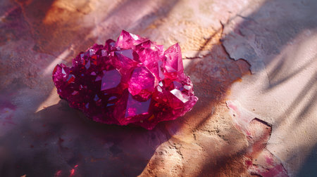 A vibrant pink quartz crystal cluster displays striking geometric shapes, resting on a contrasting dark rock. ideal for geology enthusiasts and gemstone collectors, natural beauty and mineralogical interest. Generative AI