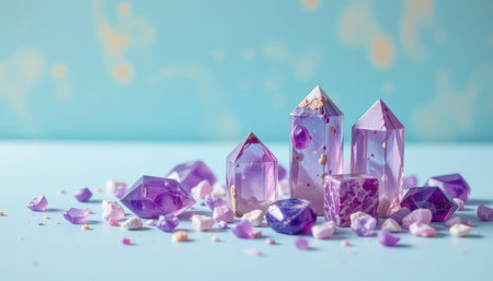 Beautiful Arrangement of Purple Crystals with Soft Blue Background Perfect for Healing, Decoration, and Spiritual Practices in Various Living Spaces