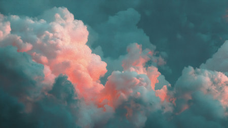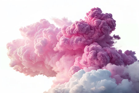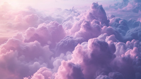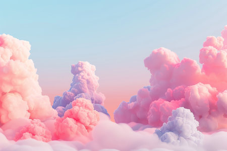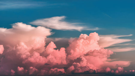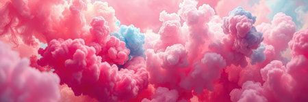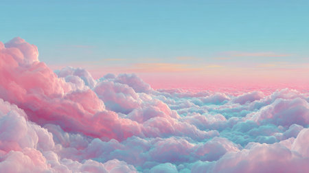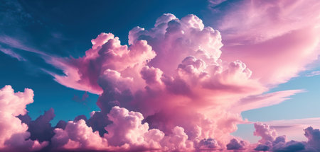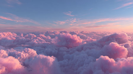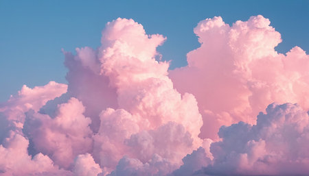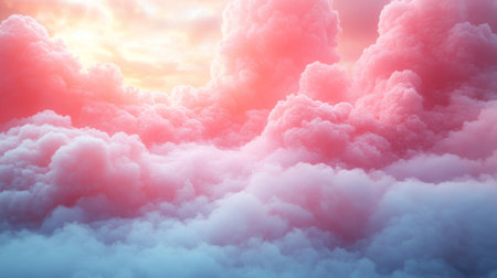 A stunning depiction of pink clouds floating in the sky, evoking the softness of fluffy cotton candy. The scene creates a dreamy, fantasy-like ambiance with pastel tones, ideal for serene,