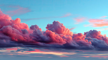 Beautiful view of pink clouds in vibrant sunset sky. Clouds are fluffy and full of light, creating stunning visual display. Dramatic unreal sky with cumulus and stratus clouds in atmosphere. AI art.
