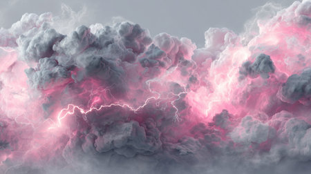 This stunning image captures dramatic storm clouds illuminated by lightning, featuring vibrant pink hues that create an awe-inspiring twilight scene.