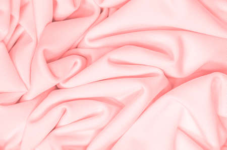 The fabric is silk of a pale red color. Texture. Background. Pattern. Silk fabric has a shiny sheen and characteristic small folds that run horizontally. She lies down in soft folds