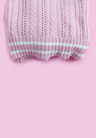 Woolen knitted pink sweater on paper background. Flatlay Topview with copy space for your text