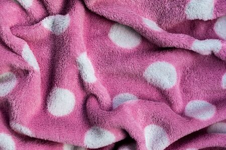 Pink delicate soft background of fur plush smooth fabric with white circles. Texture of light red soft fleecy blanket textile.