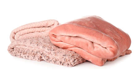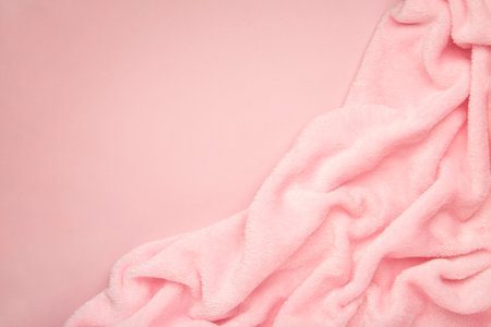 crumpled pink beige fleece blanket. comfy and warm cover. plush fabric texture background. copyspace concept.