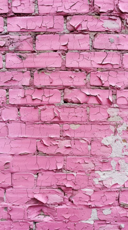 A textured surface showing a pink brick wall with extensive cracking and peeling paint, highlighting decay and the passage of time