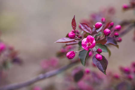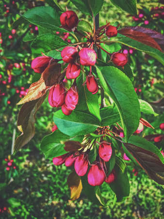 A pink decorative apple tree blooms in the beautiful light of sunset. Spring, nature wallpaper. A blooming apple tree in the garden. Blooming pink flowers on the branches of a tree. macro photography.