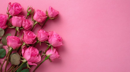 A group of pink roses sits on a pink surface. The flowers have fresh petals and green leaves. Soft lighting highlights their natural color. This scene shows a simple yet attractive arrangement.