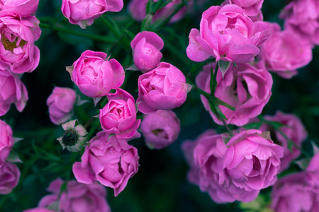 In the summer evening, pink and beautiful delicate rose flowers bloom on a bush in the garden, creating a scene filled with romance and love.