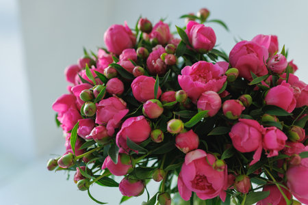 Vibrant pink peonies in full bloom with lush green leaves fresh, romantic, and elegant floral arrangement perfect for weddings, home decor, and natural beauty lovers.