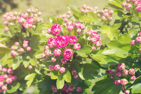 Hawthorn common pink flowering, vivid pink flowers on green leaves background. macro shot with selective focus on flowers.