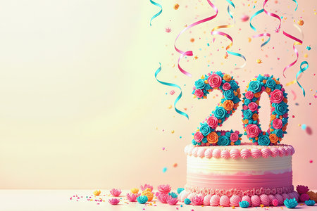 Greeting card for 20 years. Celebrate a 20th birthday with a vibrant cake adorned with colorful frosting flowers and confetti.