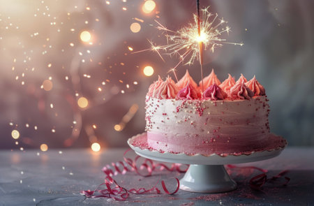 A pink cake with a sparkling sparkler placed on top of it. The cake is decorated with intricate designs and frosting, while the sparkler emits a bright light and sparks.