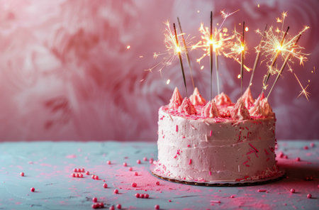 A birthday cake topped with pink frosting and lit sparklers, ready for celebration.