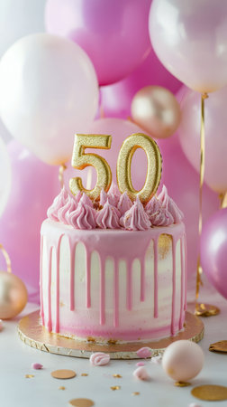 A beautifully decorated pink cake sits on a table, topped with a sparkling 50. Surrounding the cake are colorful balloons in various shades, creating a cheerful atmosphere for a birthday celebration.