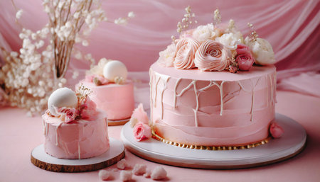 beautiful cakes and desserts in pink tones on a pink background wedding cake birthday cake valentine s day cake