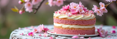 Pink blossom cake with fresh cream and cherry blossoms on a floral tablecloth. That the image is generated using AI.