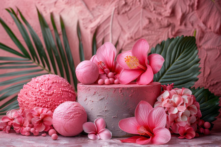 textured, pink podium sits surrounded by pink and white flowers, a lush palm leaf, and round, textured spheres.