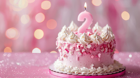 A pink and white cake sits on a pink surface, decorated with white frosting and pink sprinkles. A single lit pink candle shaped as the number two sits atop the cake. The background is a soft pink with blurred white lights.