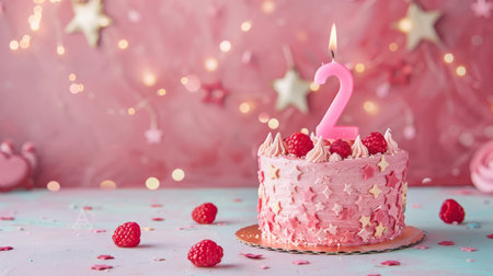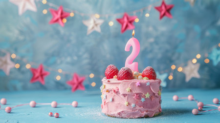 Pink raspberry cake with a number 2 candle surrounded by stars and a garland background
