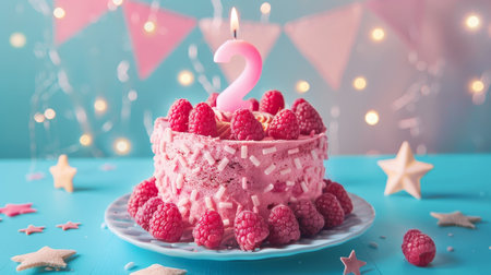 Festive raspberry cake with a pink number 2 candle surrounded by stars and garland decor