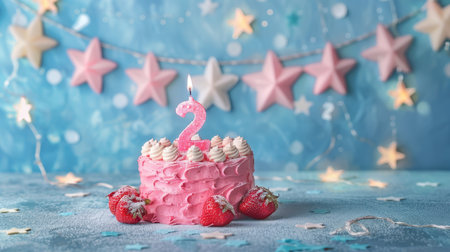 Pink number 2 candle on strawberry cake with blue background, garland, and stars decoration