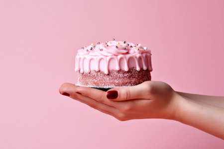 Horizontal shot of pleased young European woman smiles gently holds delicious cake celebrates birthday dressed in casual domestic clothes isolated over pink background Fe : Generative AI