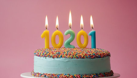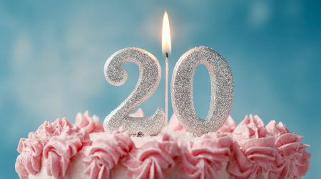 A chic pastel pink cake adorned with shimmering silver numeral candles and a solitary glowing candle, set against a vibrant blue backdrop perfect for milestone celeb