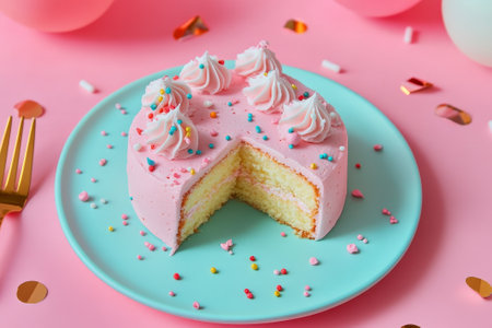 Pink mousse cake with cream filling and sprinkles in elegant slice display. That the image is generated using AI.